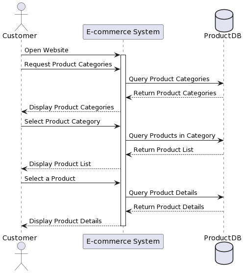 From the initial use case scenario of a customer navigating an e-commerce platform, we delve into the specifics through a sequence diagram. The diagram visually unfolds the dynamic interactions between the customer and the e-commerce system during the “Browsing Products” scenario. It starts with the customer opening the website, triggering subsequent messages such as requesting product categories, querying the database for categories, displaying categories, selecting a category, querying for products in the category, displaying the product list, selecting a product, querying for product details, and finally, displaying detailed product information. Each arrow represents a message exchanged between the customer and the e-commerce system, providing a detailed chronological account of the steps involved in the process. This sequence diagram serves as a precise and comprehensive representation of the dynamic flow, offering invaluable insights for development, testing, and understanding the intricacies of the system’s behavior.