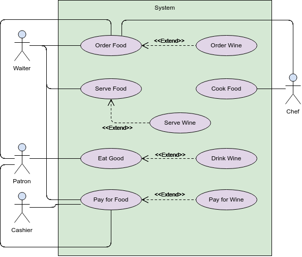 This use case diagram example depicts a model of several business use cases. The use case model represents the interactions between a restaurant (the business system) and its primary stakeholders (business actors and business workers). After the base use cases have been identified, you can structure those use case with <> and <> use cases for better clarity.