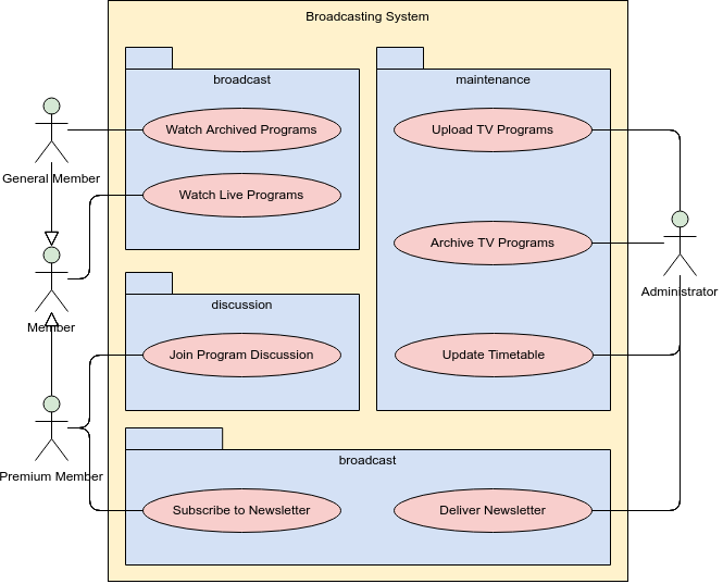 This is a use case diagram example for an online broadcasting system. Users like general member and administrator are represented as actors, while the business goals of the system, for instance, watch archived and live programs, join program discussion, upload TV programs, are represented as use cases (i.e. the oval shapes). This use case diagram uses system boundary and package shapes in organizing the use cases. This is not a must but doing so makes the whole use case diagram well-organized. Besides, the use of generalization in linking General/Premium Member with Member models the fact that the behavior defined for Member is shared among General and Premium Member.