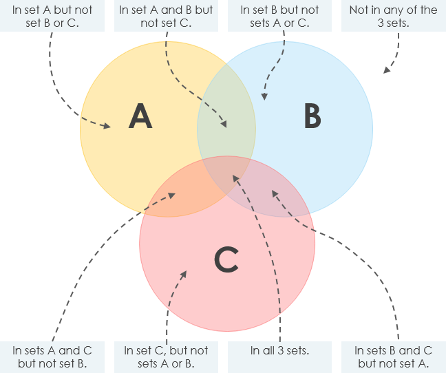 - The diagram below shows you how a Venn diagram with 3 circles works.