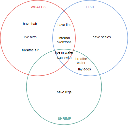 By extending the example above, this Venn diagram uses to show relationships among aquatic life-forms: whales (mammals) and fish, shrimp (aquatic creatures). In the various fields are characteristic of the aquatic creatures. In the overlaps, the creatures share properties; outside the overlaps, the creatures have different properties.