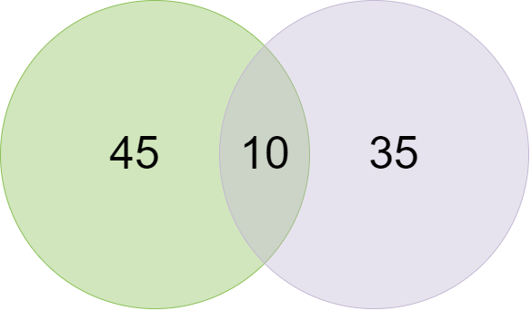 In a class of 100 students, 35 like science and 45 like math. 10 like both. How many like either of them and how many like neither?