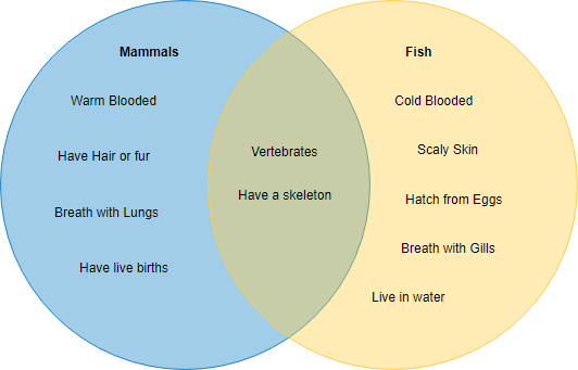 This is a Venn diagram example that shows the characteristics of mammals and fish, which are grouped as two ovals. The characteristics that are in common are placed inside the overlapping region of the two ovals.