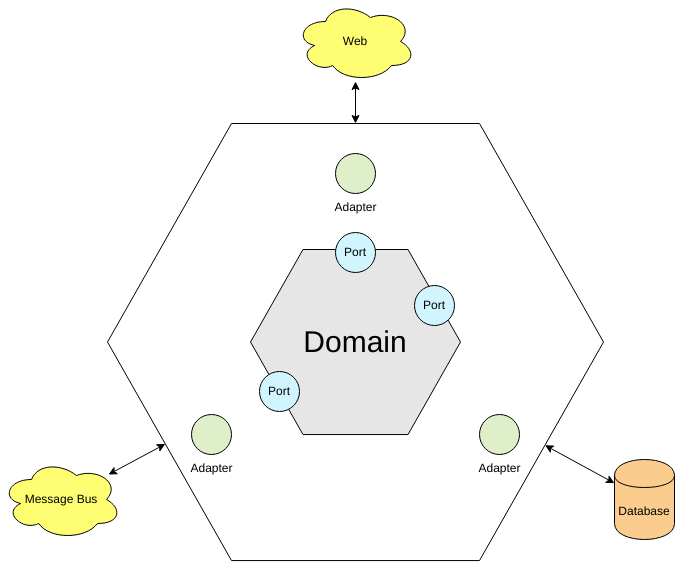 As shown in the figure above, an application can be considered as a whole is seen as a hexagon, with the business domain located inside. The application opens specific ports for establishing communication channels to and from the application code. It isolates the domain logic from the infrastructure, such as the database, message bus, mail delivery, and/ or the webserver. It can be extended to support different types of clients easily. Just add a new adapter to it. Thus, the hexagonal architecture is a natural fit for Domain-Driven Design (DDD).