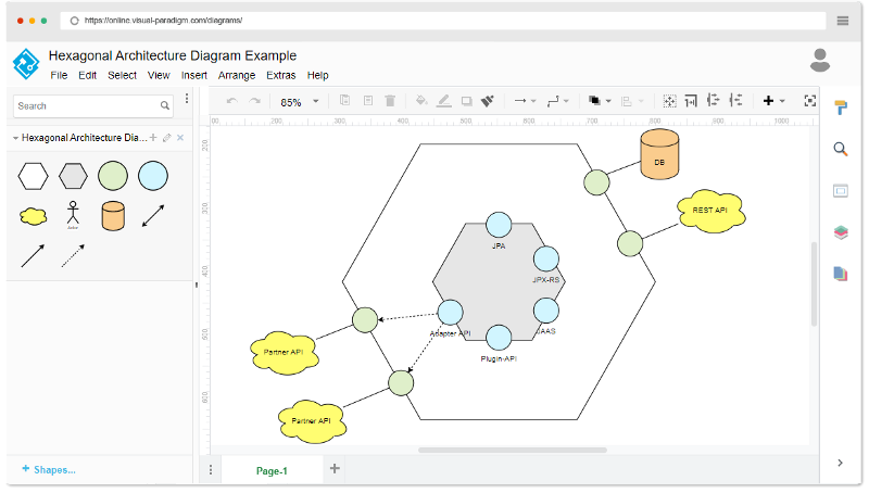 VP Online Diagrams come with a number of hexagonal architecture diagram templates. You can start from a template or to create your own from scratch. Followings are some of these templates. Simply click on the Edit button to get start.