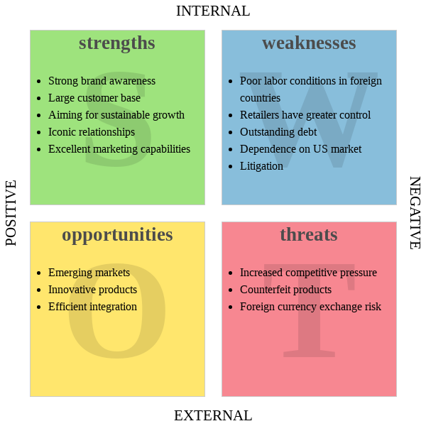 You can find NIKE’s internal problems and external influences, but you can also know the internal development strengths and external market opportunities. Among them, you can find that some of NIKE’s operating strategies are easy to use. You can learn a thing or two from the SWOT example diagram below: