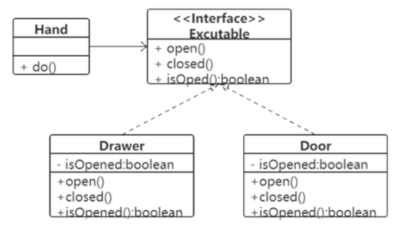 Following the example of the OCP opening and closing principle, opening and closing the door by hand depends on an interface, and the specific implementation class implements this interface.