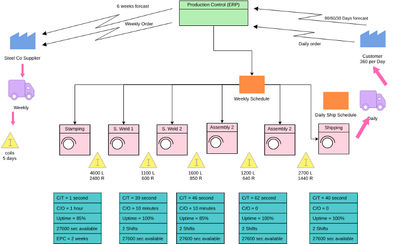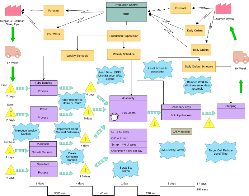 Value stream mapping is a technique to identify and eliminate process waste. It is a special type of flow chart that uses symbols called “lean language” to describe and improve inventory and information flow. It helps us provide customers with the best value through a complete value creation process and minimize waste in the following aspects:
