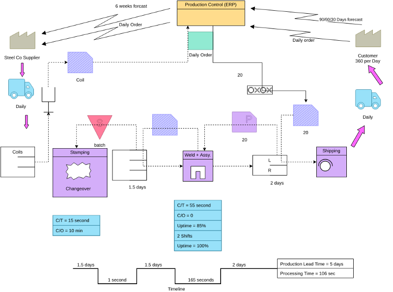 Timeline: shows value-added times (Cycle Times) and nonvalue added (wait) times. Use this to calculate Lead Time and Total Cycle Time.