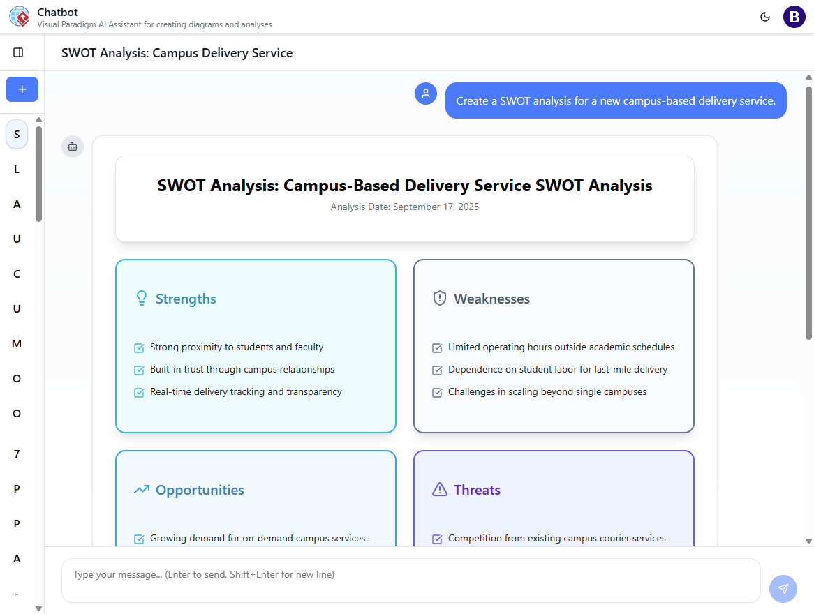 Shared chat session: https://ai-toolbox.visual-paradigm.com/app/chatbot/?share=3ecbec8e-6f88-4dac-ae4e-8a58c58c625b - “Create a SWOT analysis for a new campus-based delivery service.”