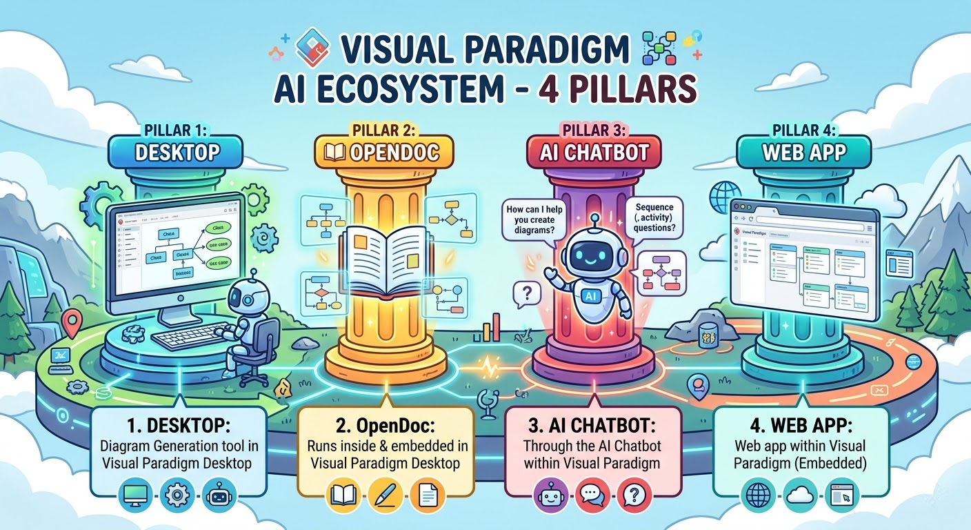 - Visual Paradigm’s AI-Powered Ecosystem: Four Platforms, One Vision for Smarter Visual Modeling: Comprehensive overview of how Visual Paradigm’s four AI-powered platforms—VP Desktop, OpenDocs, AI Visual Modeling Chatbot, and AI Apps & Studios—integrate to deliver end-to-end modeling lifecycle support from ideation to enterprise-grade delivery [[7]]