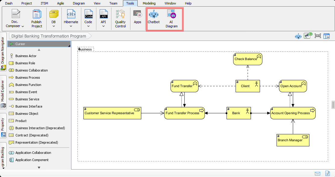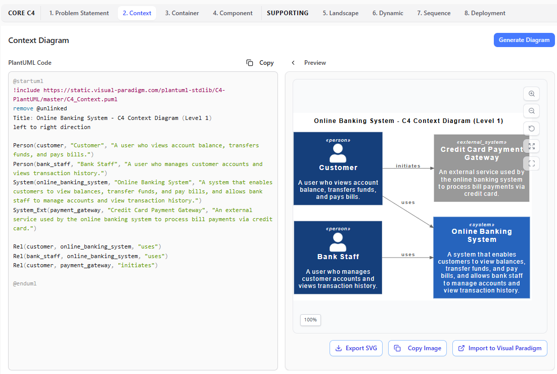 - Action: The finalized models are opened in VP Desktop for detailed engineering. Architects refine the UML classes, database schemas, and architecture. AI assists in code generation and technical validation.