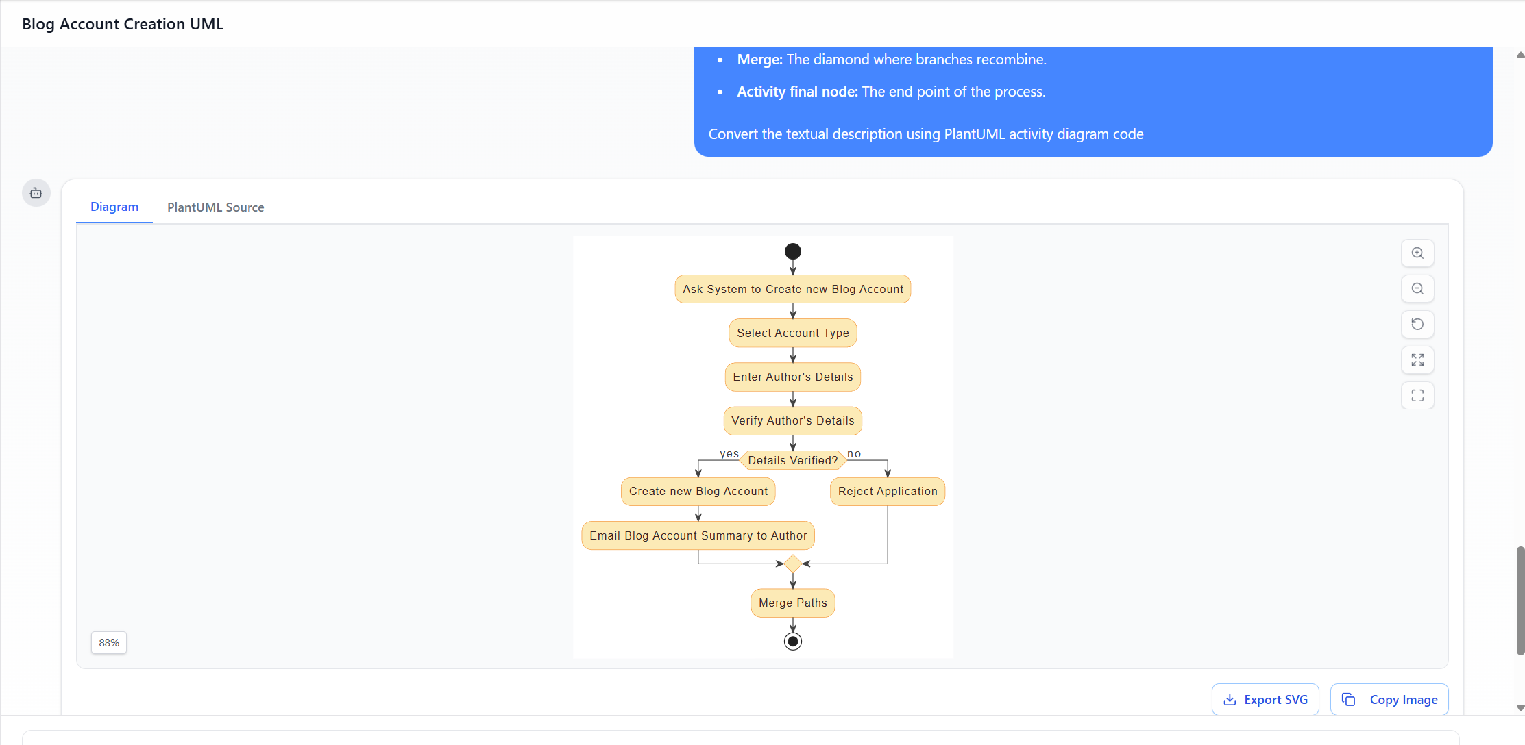 - Conversational Refinement: Iterate on the model via chat (e.g., “Add a password reset option” or “Change this to a sequence diagram”).