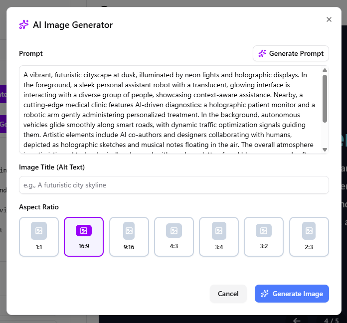 - Access the Generator: While editing your markdown slide, click on the button labeled “Generate Image”. This opens the AI Image Generator popup.