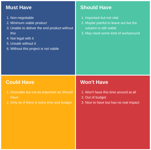 Termin MoSCoW jest akronimem utworzonym z pierwszych liter każdej z czterech kategorii priorytetyzacji, jak pokazano na poniższym rysunku: