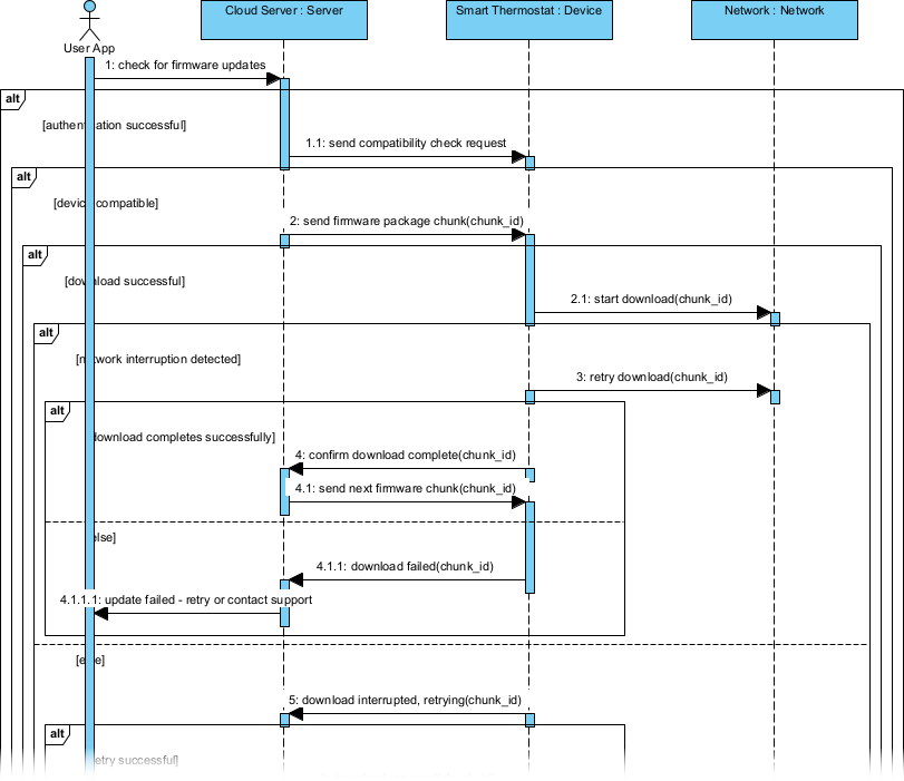 Key notations include lifelines (vertical lines representing participants like “Device” or “Server”), messages (horizontal arrows showing interactions such as requests or responses), and activations (rectangles on lifelines indicating processing time). For instance, a simple arrow might denote a synchronous call, while a dashed line represents a return message. Fragments like loops or alternatives handle conditional flows, such as retry mechanisms in updates.