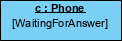 You can associate a state machine with a class, which is especially useful when modeling event-driven systems or when modeling the lifetime of a class. In these cases, you can also show the state of this machine for a given object at a given time. For example, as class shows below, the object c (an instance of the class Phone) is indicated in the state WaitingForAnswer, a named state defined in the state machine for Phone.