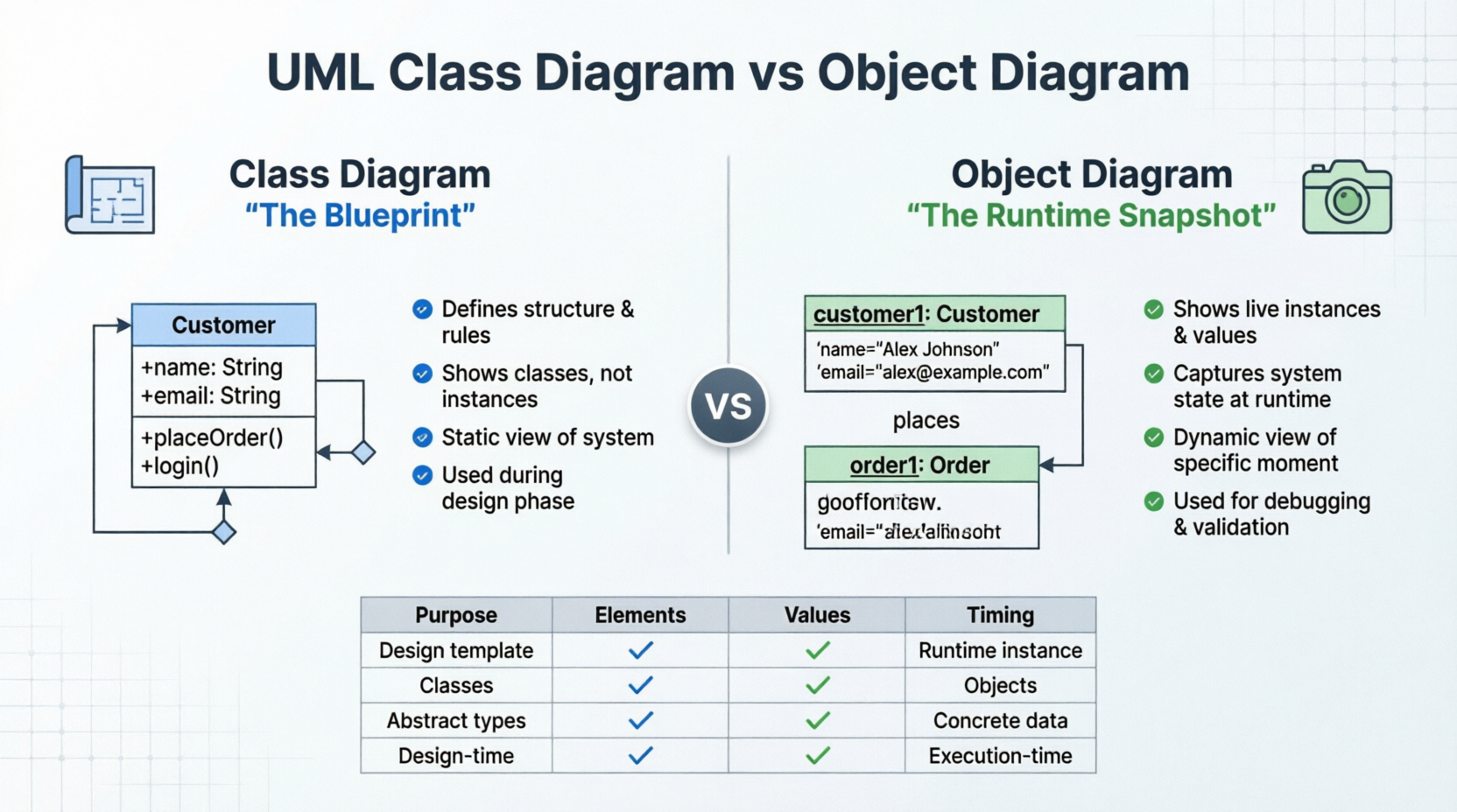 | Feature | Class Diagram | Object Diagram |