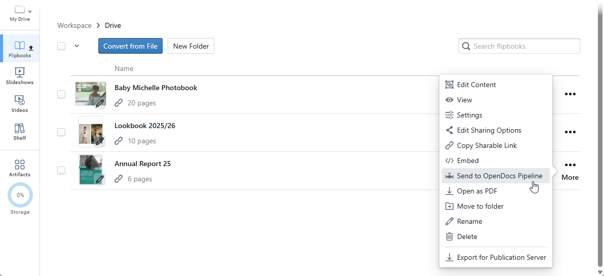 Locate your flipbook and click More… → Send to OpenDocs [Pipeline]