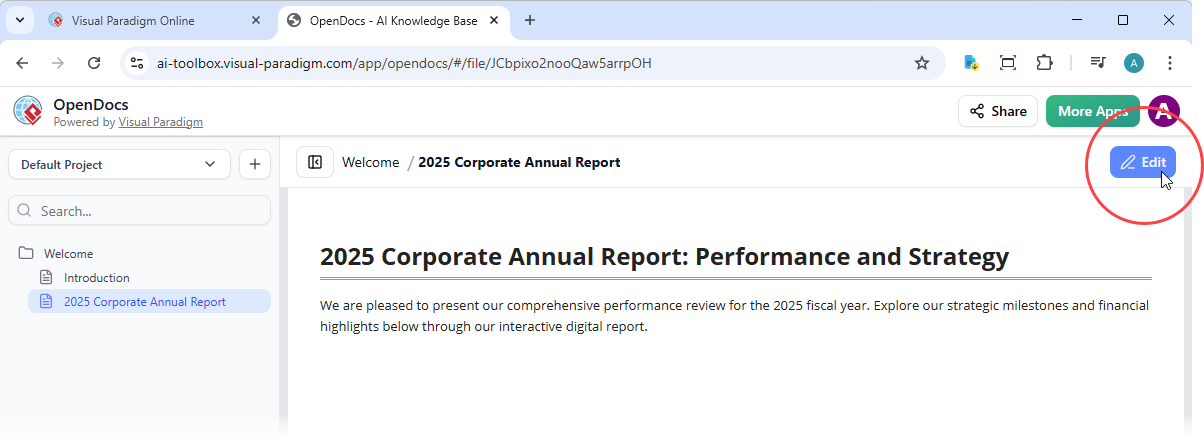 OpenDocs is an AI-powered knowledge management and documentation platform developed by Visual Paradigm. It functions as a “visual knowledge engine,” allowing individuals and teams to create, organize, and share documents and professional diagrams in a single, web-based workspace.