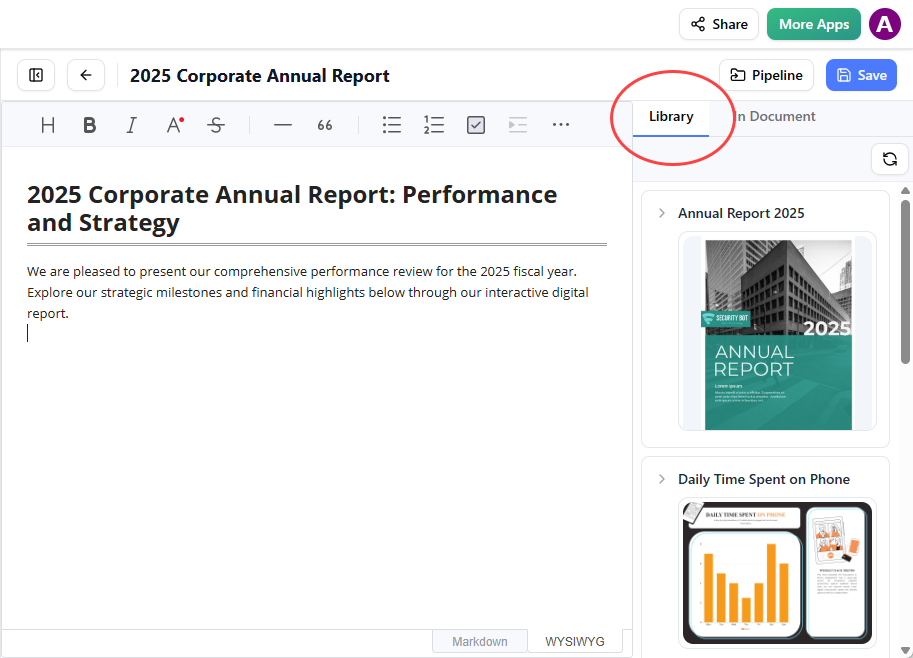 Use the Pipeline button to insert shared assets into your OpenDocs page
